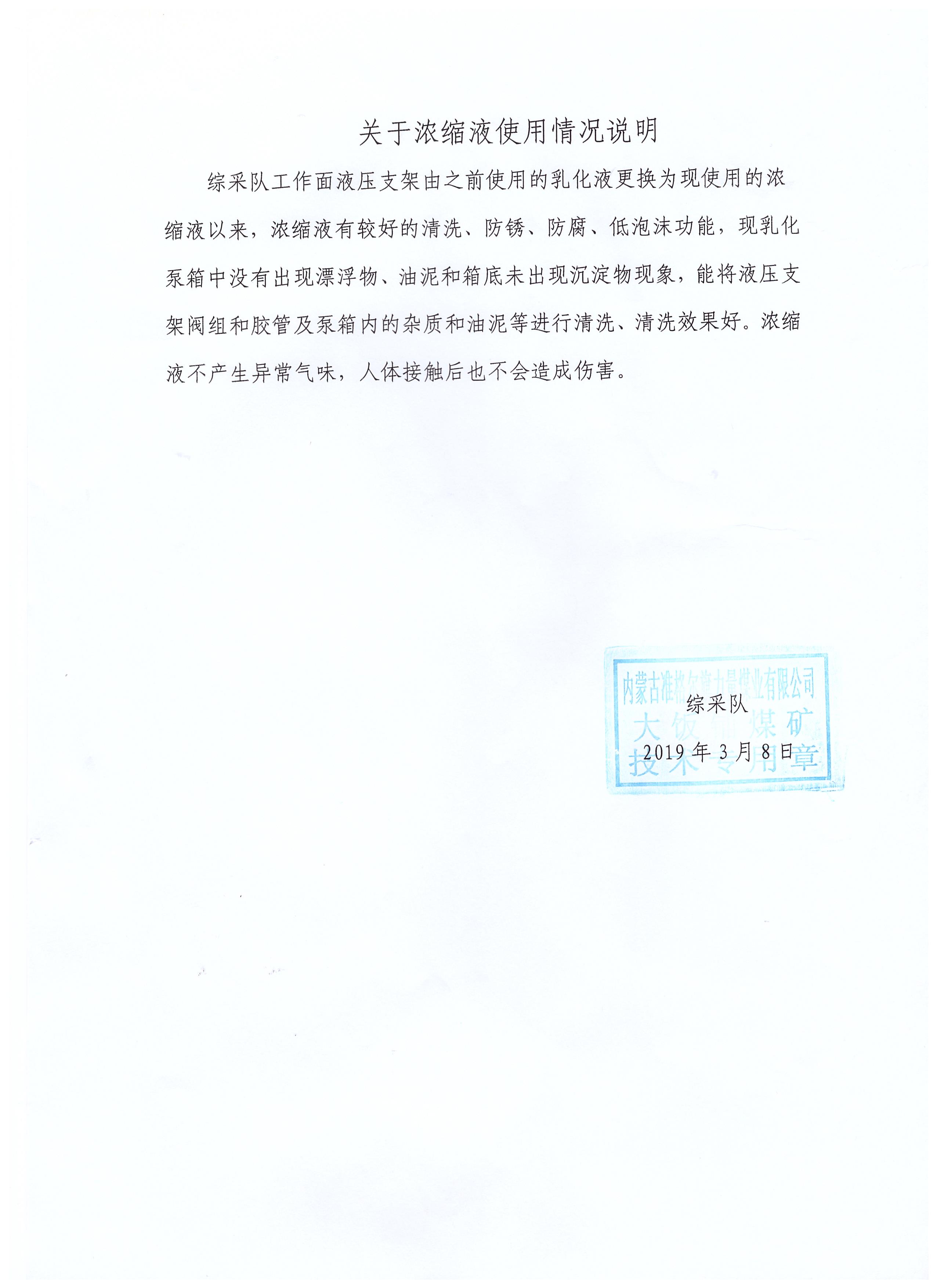 目前我公司生產(chǎn)的液壓支架濃縮液、乳化油、防凍液、切削液產(chǎn)品已經(jīng)在中國中煤能源集團(tuán)有限公司、中天合創(chuàng)能源有限責(zé)任公司、鄂爾多斯市伊化礦業(yè)資源有限責(zé)任公司、中煤平朔集團(tuán)有限公司、華能集團(tuán)、同煤集團(tuán)、三一重型裝備有限公司、鄭煤機(jī)集團(tuán)股份有限公司、神華新疆能源有限公司、神華寧夏煤業(yè)集團(tuán)有限責(zé)任公司等大型煤機(jī)廠、機(jī)加工及煤礦廣泛應(yīng)用,產(chǎn)品質(zhì)量、售后服務(wù)贏得客戶認(rèn)可。